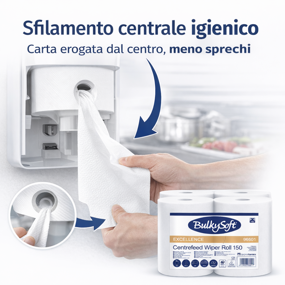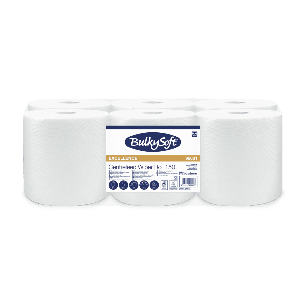 Le bobine asciugatutto BulkySoft Excellence Centrefeed da 150 metri sono progettate per garantire massima assorbenza, resistenza e igiene negli ambienti professionali. Realizzate in pura cellulosa di alta qualità, offrono un’asciugatura efficace e rapida, riducendo gli sprechi grazie allo sfilamento centrale controllato.