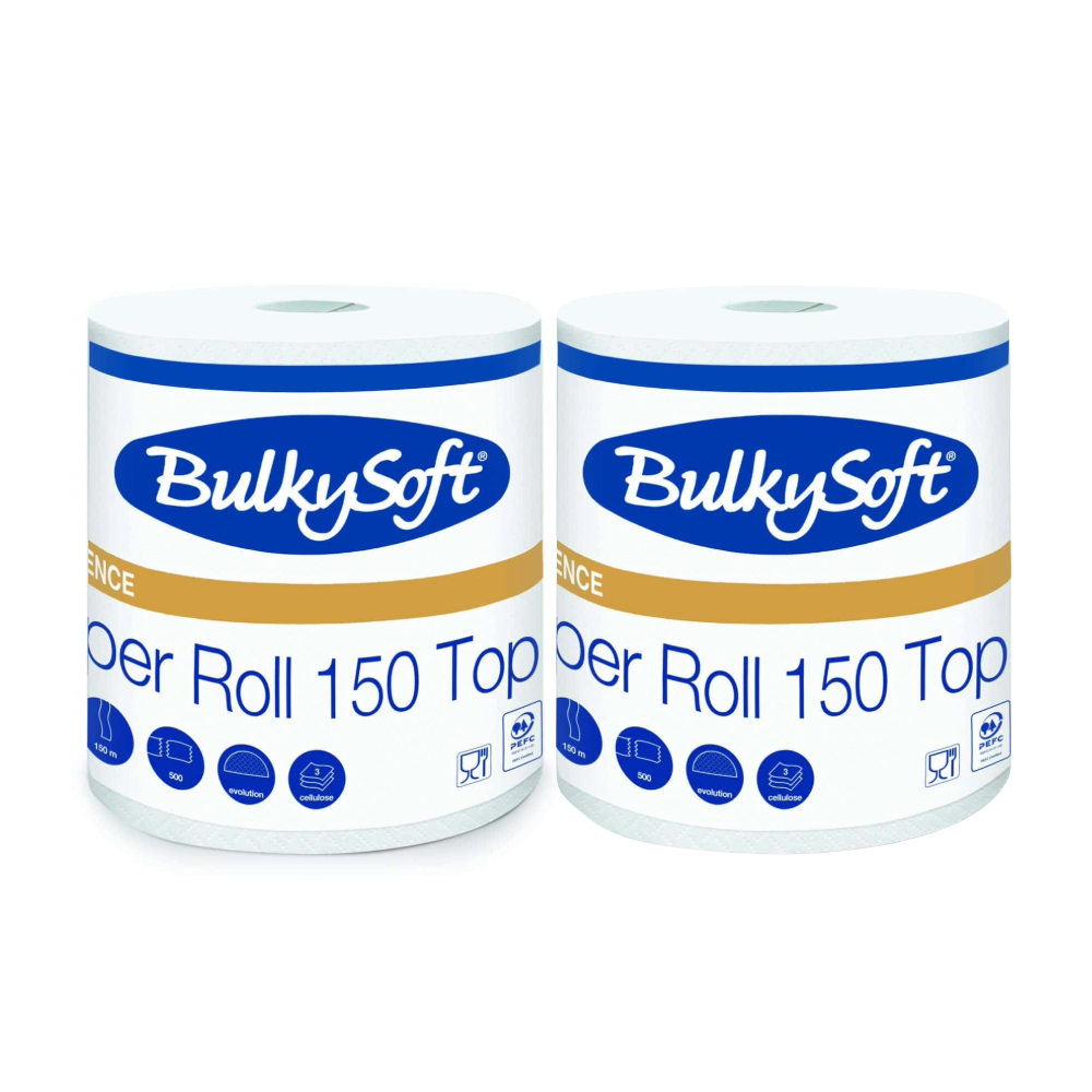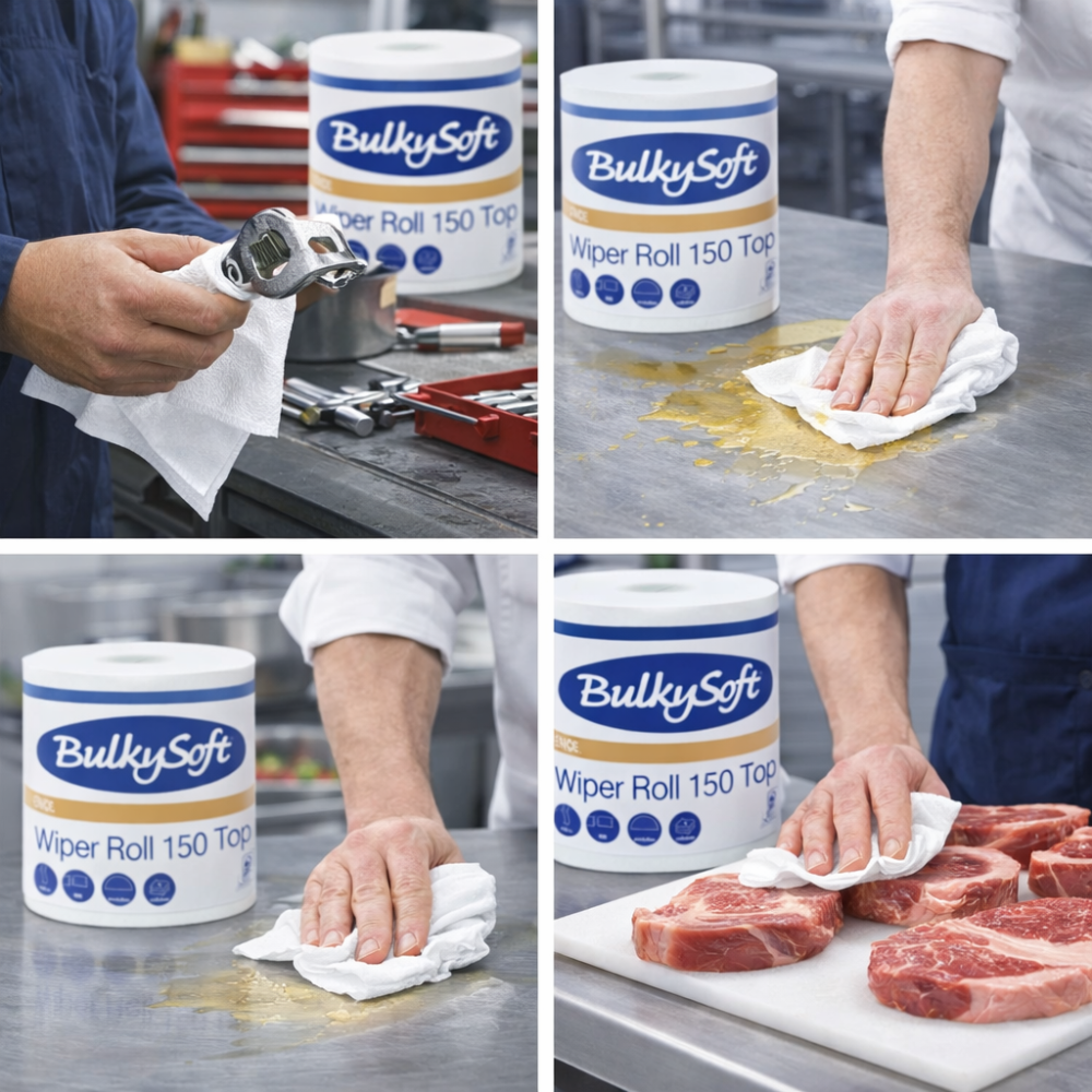 Rotolo pulitutto professionale BulkySoft® Excellence in pura cellulosa a 3 veli, altamente assorbente e resistente. Ideale per pulizia e asciugatura in ambienti professionali e industriali anche per uso alimentare e gastronomico. Confezione da 2 rotoli da 150 m ciascuno.
