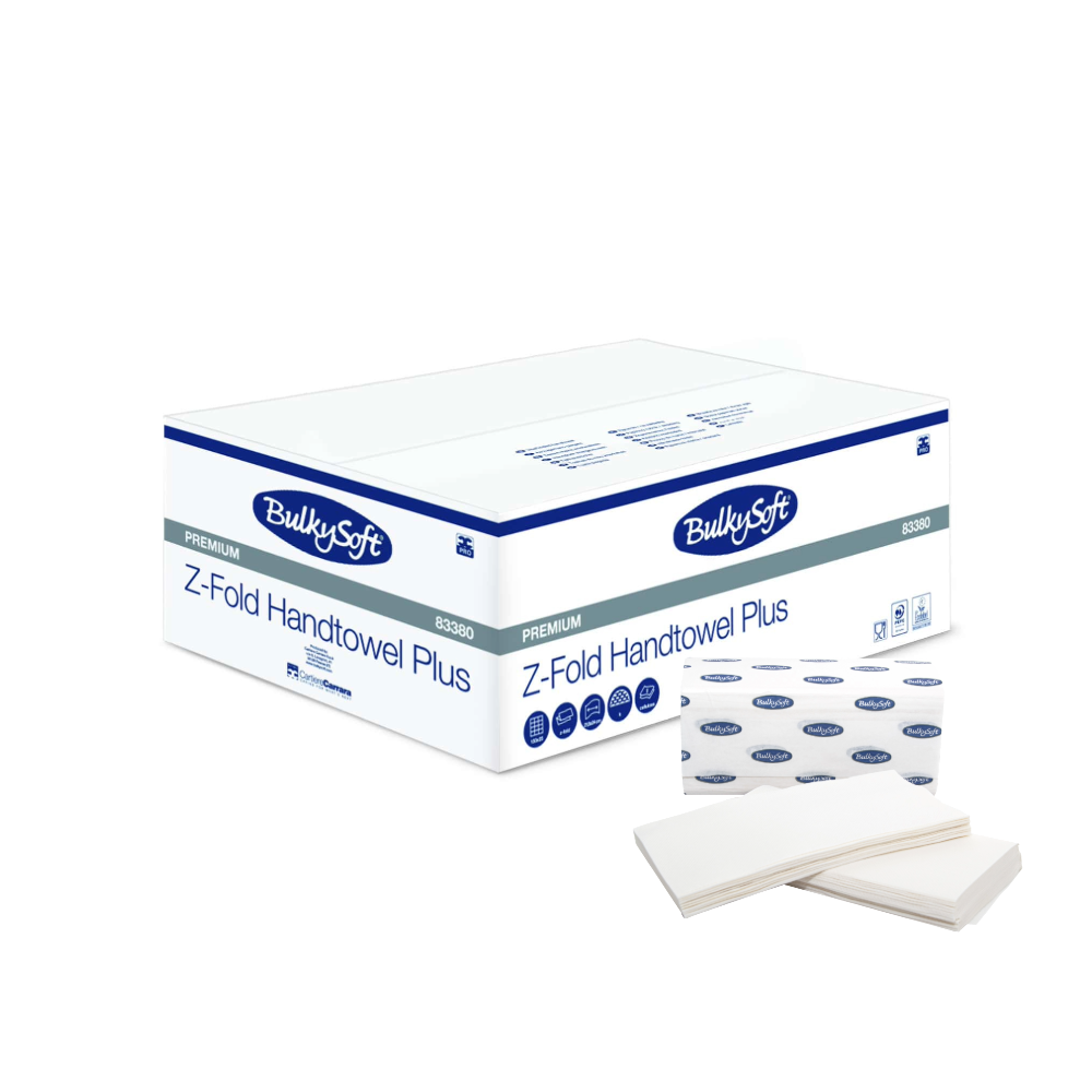Gli asciugamani piegati a Z BulkySoft® Premium Z-Fold Handtowel Plus sono realizzati in pura cellulosa a 2 veli, colore bianco, con goffratura K per una migliore capacità assorbente e una piacevole sensazione al tatto.