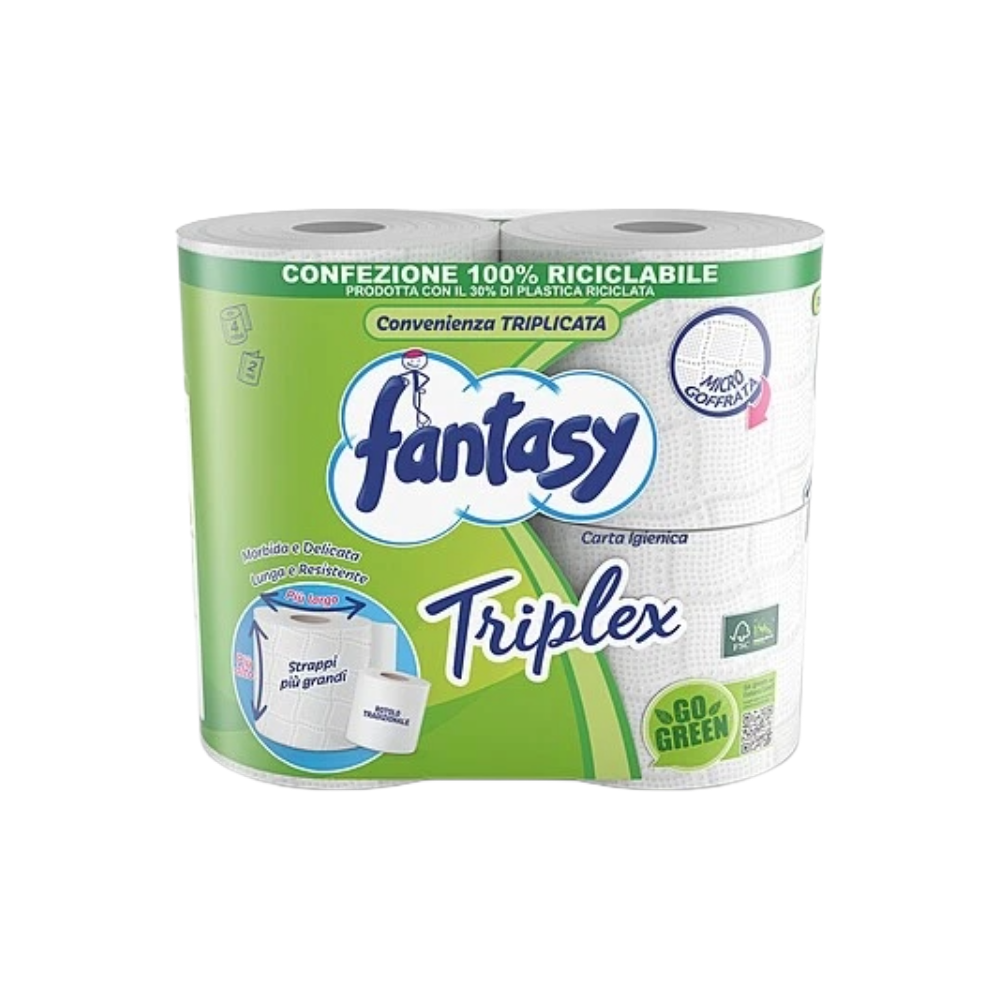 Carta igienica micro goffrata Fantasy Triplex a 3 veli, morbida, resistente, ideale per uso domestico e professionale. Confezioni pratiche da 4 rotoli, garantisce comfort, assorbenza e durata.