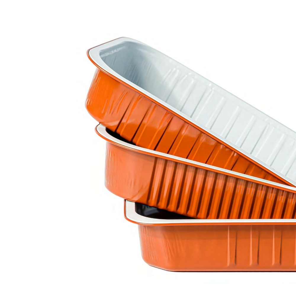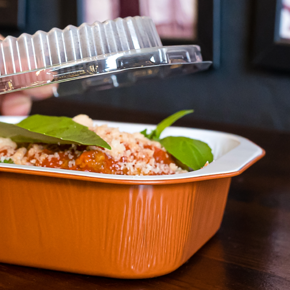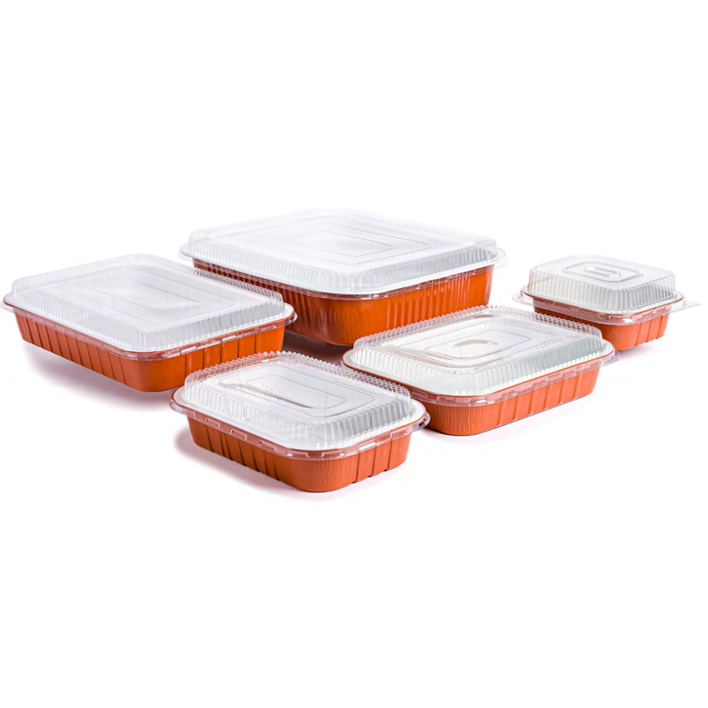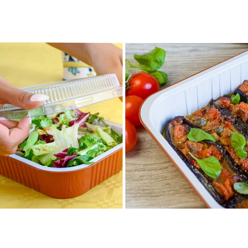 La nostra linea di contenitori extra-rigidi in alluminio laccato Bianco/Rame è la soluzione ideale sia per l’uso casalingo che per take-away, food delivery, fast food, catering e ristoranti. Le vaschette sono idonee a riscaldare e cucinare i cibi in forno tradizionale e a microonde, ma possono essere utilizzate anche per la conservazione in frigorifero e in freezer.