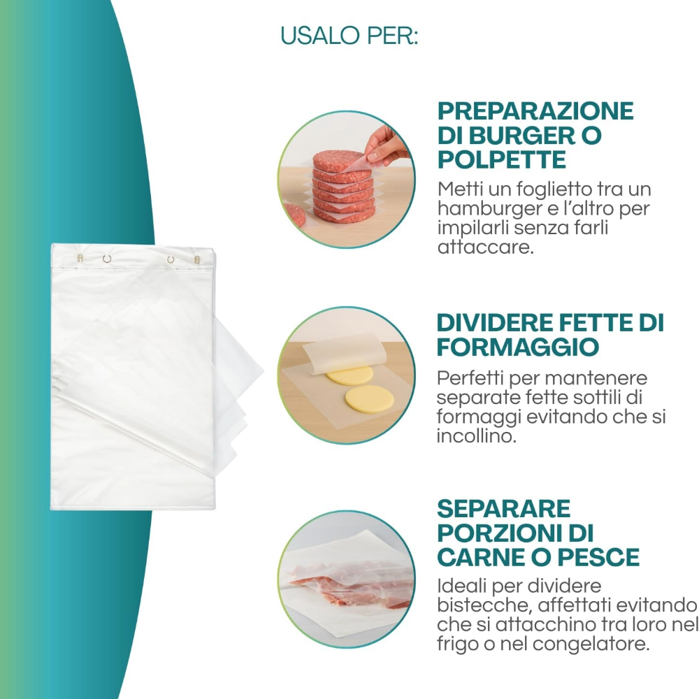 Ideali per macellerie, gastronomie, salumerie, pescherie, panifici e supermercati. Perfetti come fogli separatori tra alimenti freschi, affettati e preparazioni, aiutano a mantenere ordine, igiene e qualità del prodotto durante la lavorazione e la conservazione.