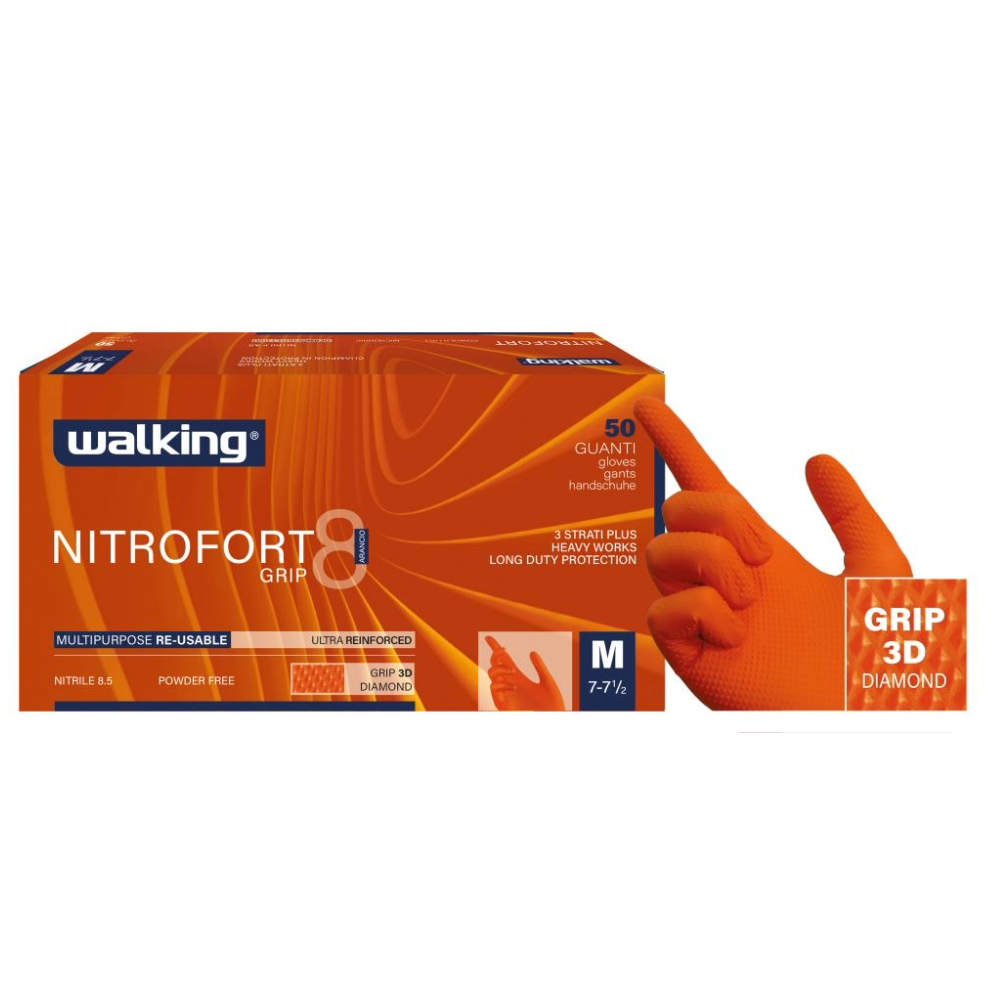 Guanto in Nitrile arancio grip Walking Nitrofort arancio 8 Grip, riusabile e resistente – confezione da 50 pezzi.