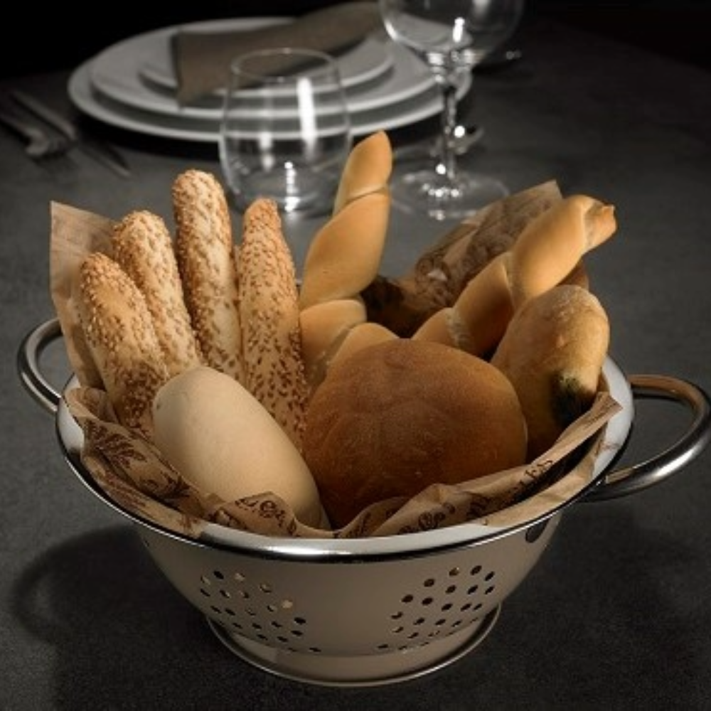 Scolapasta compatto e versatile, realizzato in acciaio inox di alta qualità, pensato non solo per lo scolaggio ma soprattutto come contenitore ideale per piccole portate da portare direttamente a tavola. Perfetto per pane, grissini, focaccine, verdure, stuzzichini, finger food e molto altro.