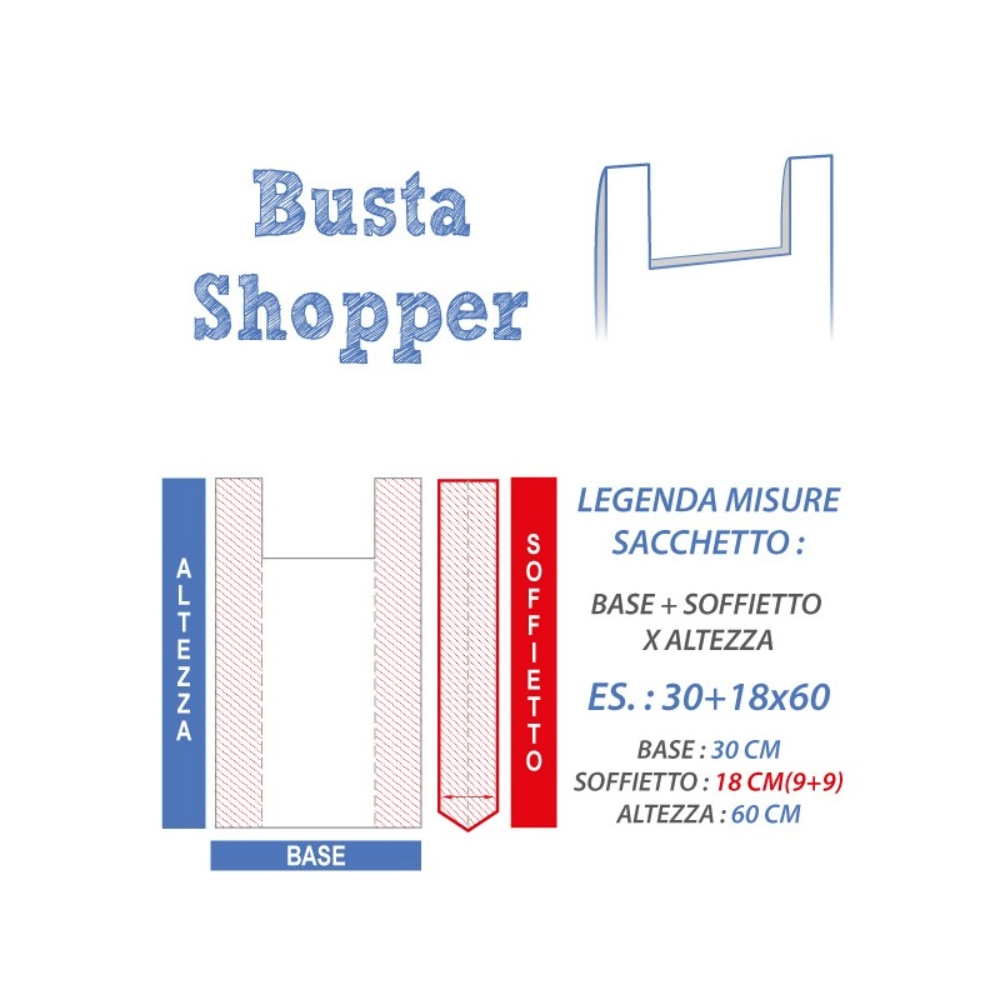 | Misura | MINI 23 cm(base) +14 cm(soffietto) x 44 cm(altezza) – Conf. 3 Kg., MEDIA 28 cm(base) +16 cm(soffietto) x 50 cm(altezza) – Conf. 4 Kg., MAXI 30 cm(base) +18 cm(soffietto) x 60 cm(altezza) – Conf. 6 Kg. |