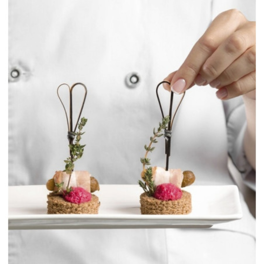 Gli spiedi a forma di cuore in bamboo nero sono la scelta ideale per aggiungere un tocco elegante e originale alla presentazione di finger food e preparazioni gastronomiche. Realizzati in bamboo resistente e rifiniti in colore nero, uniscono praticità e design moderno, rendendo ogni servizio più curato.