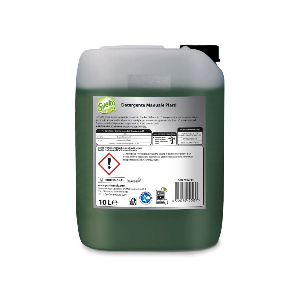 Svelto Liquido Più Limone Professionale è il detergente liquido concentrato per il lavaggio manuale di stoviglie, pentole, vasellame, bicchieri e di tutti gli utensili lavabili della cucina. La miscela specifica di tensioattivi in esso contenuta garantisce l’efficace rimozione di grassi e residui di cibo facilitando il risciacquo e assicurando stoviglie brillanti e senza aloni. Testato dermatologicamente, delicato sulle mani, il suo pH è neutro per la pelle, di cui rispetta il naturale equilibrio. Con vero succo di limone, lascia una gradevole profumazione di pulito.