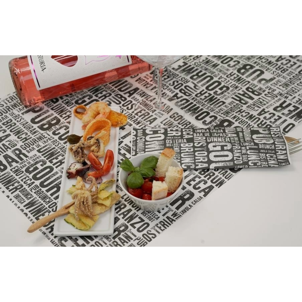 Tovaglietta di carta monovelo con scritte stampate nero su bianco. Ideale per apparecchiare in modo molto informale ed economico la tavola al pub, in birreria, in enoteca. La tovaglietta Gourmet è pratica e resistente per pasti veloci, può essere anche la soluzione low cost per organizzare pause pranzo veloci nel tuo locale.
