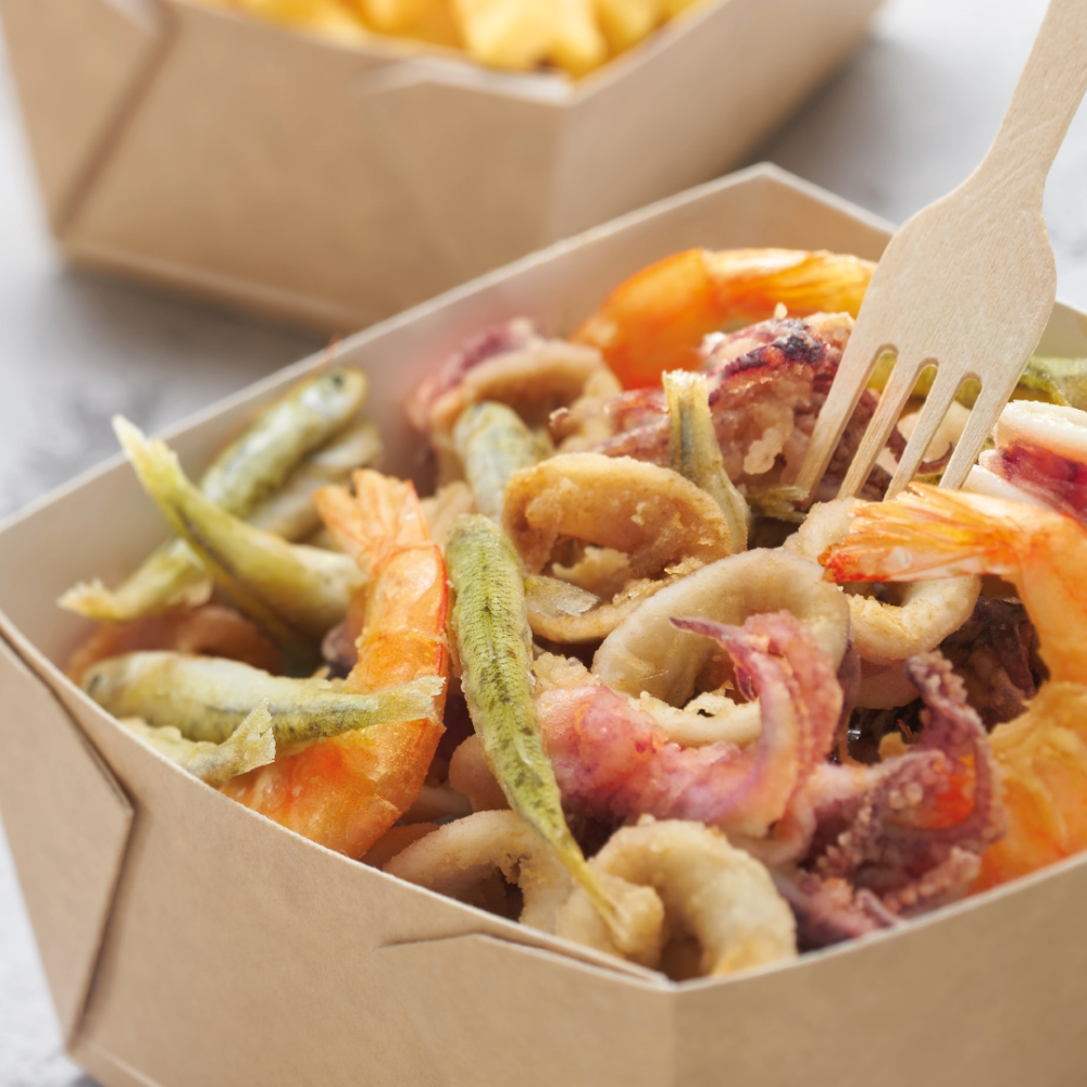 E’ un contenitore monouso specifico per cibi fritti e patatine, è progettato per l’asporto e lo street food, con un rivestimento oleo-resistente che mantiene la croccantezza del cibo.