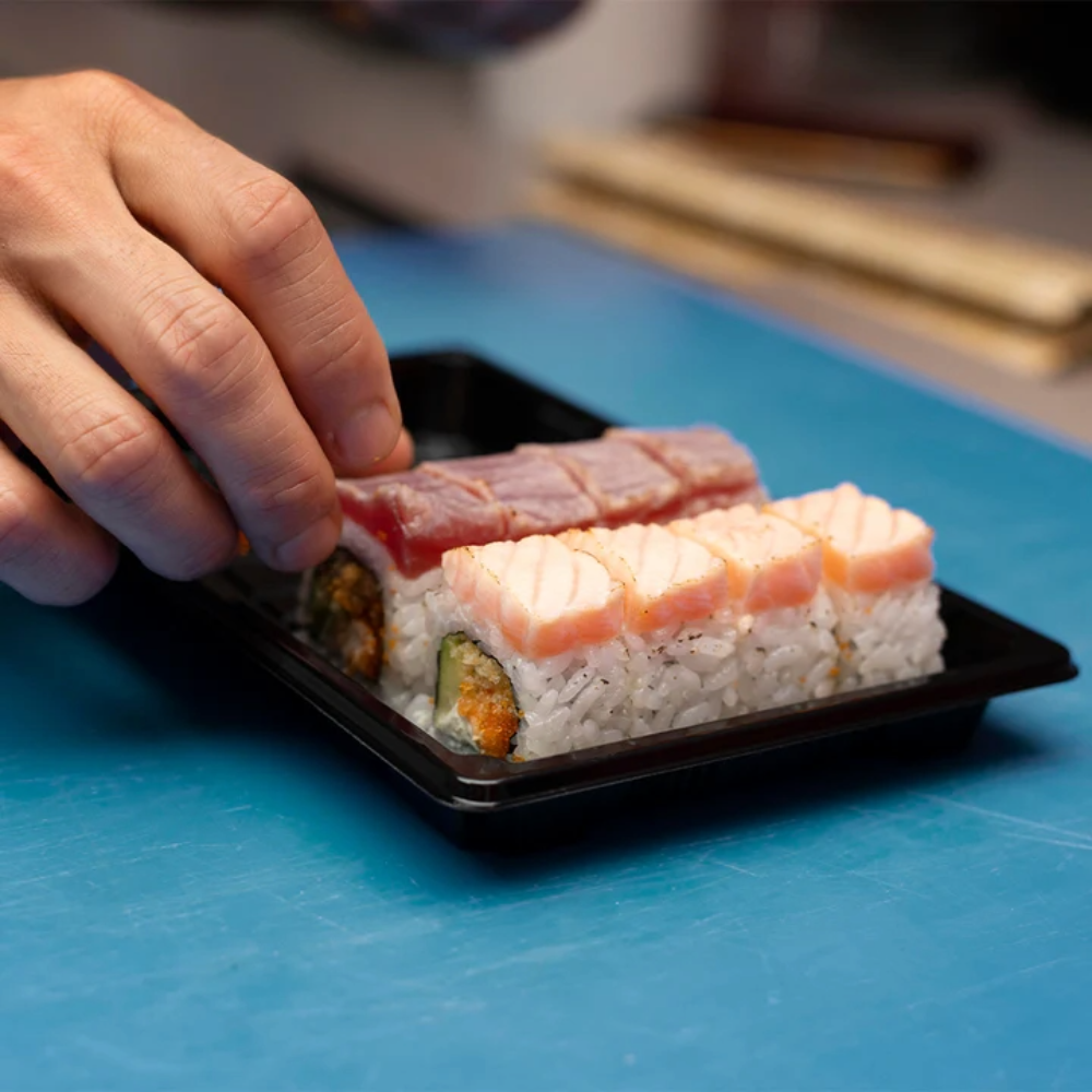 Contenitori sushi in PET riciclabili, contenitori per take-away eleganti, vaschette nere con coperchio trasparente, packaging per ristoranti giapponesi, contenitori per cibo da asporto riciclabili, vassoi sushi monouso, contenitori per gastronomia, vaschette per delivery, contenitori per frutta e antipasti, packaging monouso sostenibile per sushi.